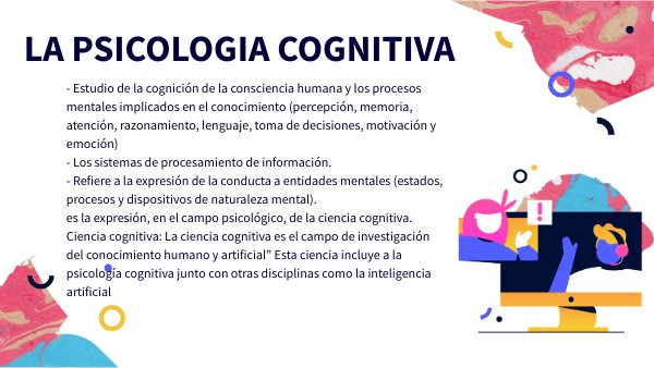 - Estudio de la cognición de la consciencia humana y los procesos mentales implicados en el conocimiento (percepción, memoria, atención, razonamiento, lenguaje, toma de decisiones, motivación y emoción) - Los sistemas de procesamiento de información. - Refiere a la expresión de la conducta a entidades mentales (estados, procesos y dispositivos de naturaleza mental). es la expresión, en el campo psicológico, de la ciencia cognitiva. Ciencia cognitiva: La ciencia cognitiva es el campo de investigación del conocimiento humano y artificial” Esta ciencia incluye a la psicología cognitiva junto con otras disciplinas como la inteligencia artificial