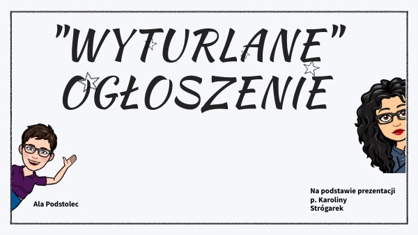 Zawiadamiam, uczniów klasy 5, że na środowej lekcji języka polskiego odbędzie się premiera gry "Wyturlane ogłoszenie". Wydarzenie odbędzie się na platformie Teams. W czasie zabawy utrwalimy zasady redagowania ogłoszenia i stworzymy trzy krótkie formy wypowiedzi. Polonistka na zastępstwie