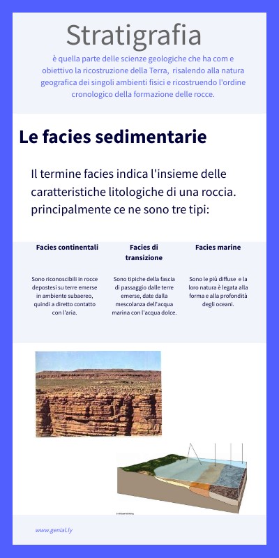 Il termine facies indica l'insieme delle caratteristiche litologiche di una roccia. principalmente ce ne sono tre tipi:
