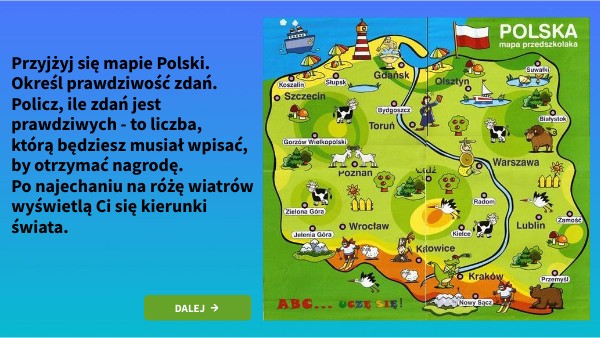 Przyjżyj się mapie Polski. Określ prawdziwość zdań. Policz, ile zdań jest prawdziwych - to liczba, którą będziesz musiał wpisać, by otrzymać nagrodę. Po najechaniu na różę wiatrów wyświetlą Ci się kierunki świata.