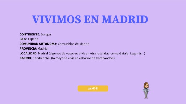CONTINENTE: EuropaPAÍS: España COMUNIDAD AUTÓNOMA: Comunidad de Madrid PROVINCIA: Madrid LOCALIDAD: Madrid (algunos de vosotros vivís en otra localidad como:Getafe, Leganés...) BARRIO: Carabanchel (la mayoría vivís en el barrio de Carabanchel)