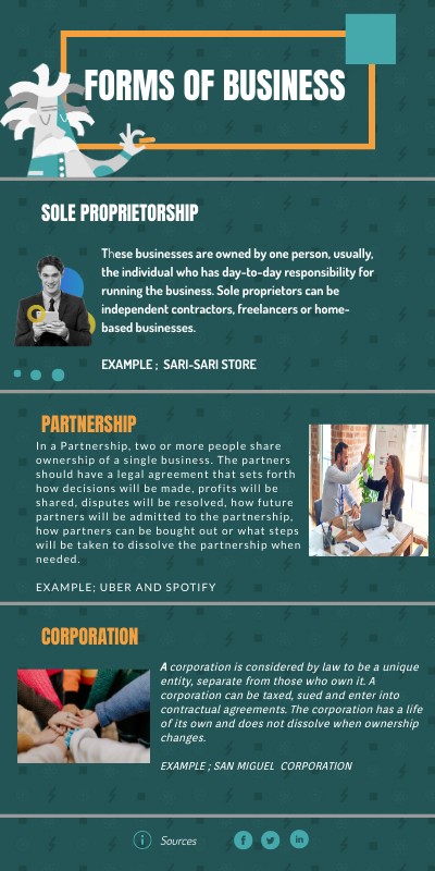 These businesses are owned by one person, usually, the individual who has day-to-day responsibility for running the business. Sole proprietors can be independent contractors, freelancers or home-based businesses. EXAMPLE ; SARI-SARI STORE