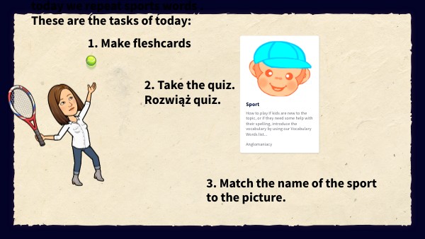 Good morning, today we repeat sports words . These are the tasks of today: