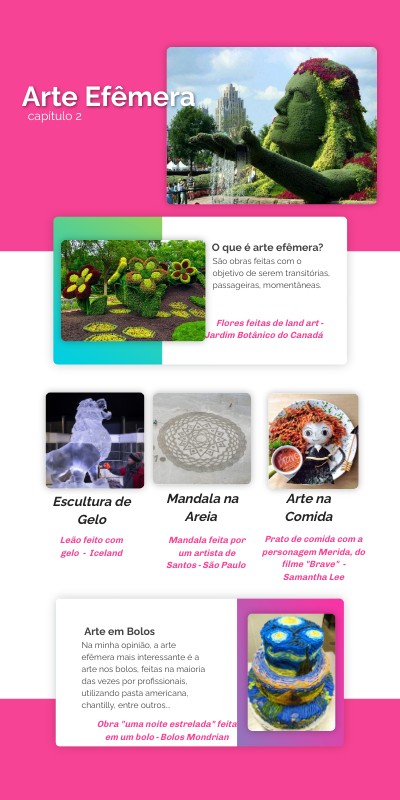 Na minha opinião, a arte efêmera mais interessante é a arte nos bolos, feitas na maioria das vezes por profissionais, utilizando pasta americana, chantilly, entre outros...