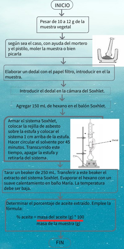 Armar el sistema Soxhlet, colocar la rejilla de asbesto sobre la estufa y colocar el sistema 1 cm arriba de la estufa. Hacer circular el solvente por 45 minutos. Transcurrido este tiempo, apagar la estufa y retirarla del sistema.