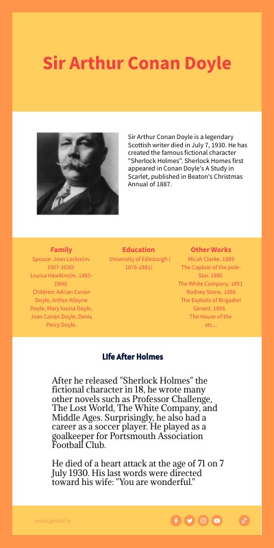 After he released "Sherlock Holmes" the fictional character in 18, he wrote many other novels such as Professor Challenge, The Lost World, The White Company, and Middle Ages. Surprisingly, he also had a career as a soccer player. He played as a goalkeeper for Portsmouth Association Football Club. He died of a heart attack at the age of 71 on 7 July 1930. His last words were directed toward his wife: "You are wonderful."