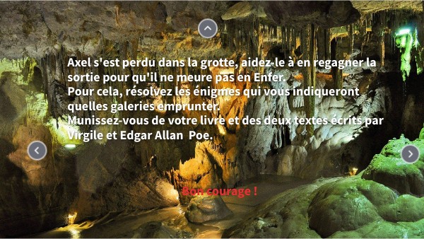 Axel s'est perdu dans la grotte, aidez-le à en regagner la sortie pour qu'il ne meure pas en Enfer. Pour cela, résolvez les énigmes qui vous indiqueront quelles galeries emprunter. Munissez-vous de votre livre et des deux textes écrits par Virgile et Edgar Allan Poe.