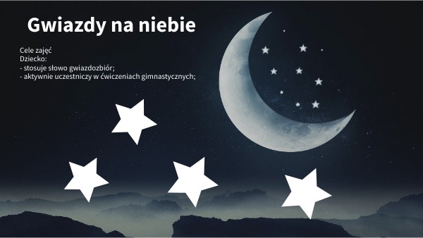 Cele zajęć Dziecko: - stosuje słowo gwiazdozbiór; - aktywnie uczestniczy w ćwiczeniach gimnastycznych;