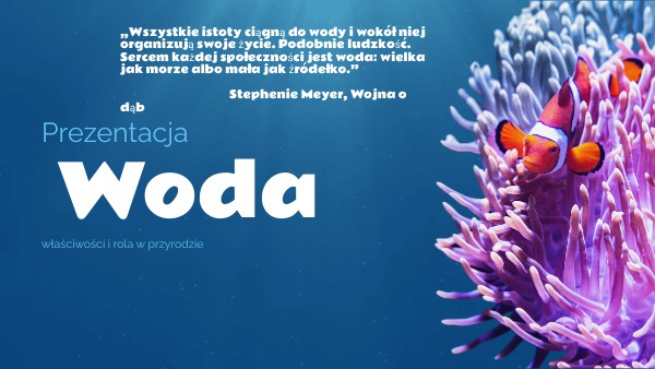 Woda jest nam niezbędna do życia. Używamy ją codzienne. Można ją wypić, umyć się nią, podlać rośliny, bądź wytworzyć z niej prąd w elektrowniach wodnych. Większość procesów zachodzących w środowisku przyrodniczym, zachodzi z udziałem wody, lub w środowisku wodnym.