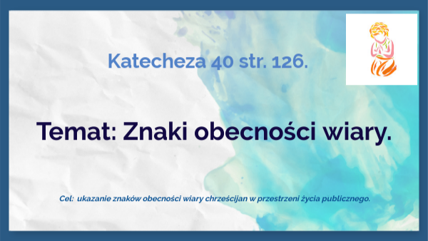 Temat: Znaki obecności wiary. (temat 40) 1. Tradycje i zwyczaje religijne sa znakami obecności wiary na co dzień. Napisz, jakie podejmujesz działania w swojej rodzinie, wśród bliskich, aby je zachować. 2. Wymień znaki wiary obecne w przestrzeni publicznej.
