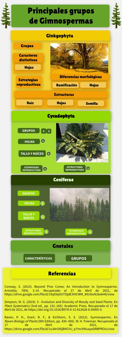 Conway, S. (2013). Beyond Pine Cones: An Introduction to Gymnosperms. Arnoldia, 70(4), 2-14. Recuperado el 17 de Abril de 2021, de https://drive.google.com/file/d/19qSVp0UTOjdE3VtCWM_891I0uN1bxkH6/view Simpson, M. G. (2019). 5 - Evolution and Diversity of Woody and Seed Plants. En Plant Systematics (2nd ed., pp. 131–165). Academic Press. Recuperado el 17 de Abril de 2021, de https://doi.org/10.1016/B978-0-12-812628-8.50005-5. Raven, P. H., Evert, R. F., & Eichhorn, S. E. (2012). Gymnosperms. En Raven Biology of Plants (8th Edition, pp. 430–456). W. H. Freeman. Recuperado el 17 de Abril de 2021, de https://drive.google.com/file/d/1u3ArG8QB4CHJ_p7mc9iKuayaSRBPROiz/view