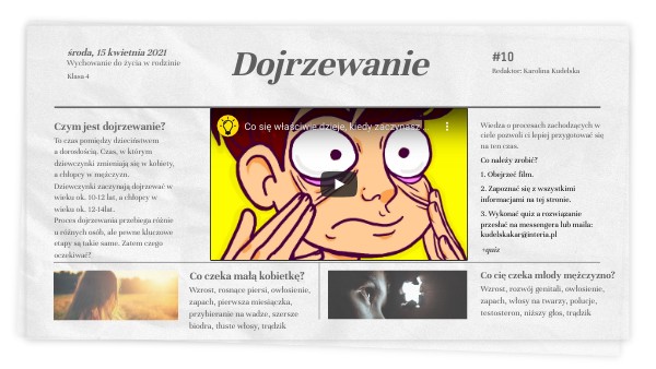 Wiedza o procesach zachodzących w ciele pozwoli ci lepiej przygotować się na ten czas. Co należy zrobić? 1. Obejrzeć film. 2. Zapoznać się z wszystkimi informacjami na tej stronie. 3. Wykonać quiz a rozwiązanie przesłać na messengera lub maila: kudelskakar@interia.pl