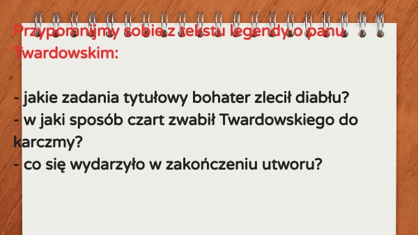 Przypomnijmy sobie z tekstu legendy o panu Twardowskim:- jakie zadania tytułowy bohater zlecił diabłu? - w jaki sposób czart zwabił Twardowskiego do karczmy? - co się wydarzyło w zakończeniu utworu?
