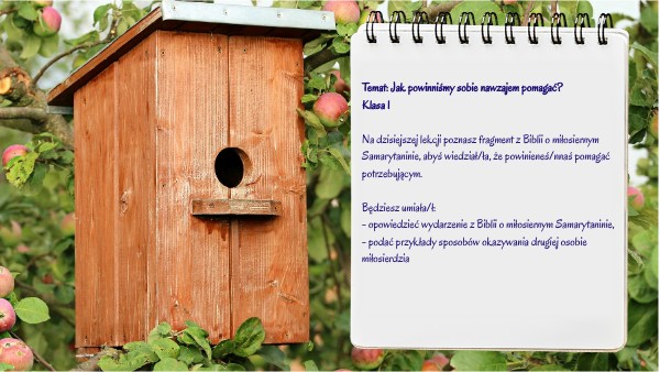 Temat: Jak powinniśmy sobie nawzajem pomagać? Klasa 1 Na dzisiejszej lekcji poznasz fragment z Biblii o miłosiernym Samarytaninie, abyś wiedział/ła, że powinieneś/nnaś pomagać potrzebującym. Będziesz umiała/ł: - opowiedzieć wydarzenie z Biblii o miłosiernym Samarytaninie, - podać przykłady sposobów okazywania drugiej osobie miłosierdzia