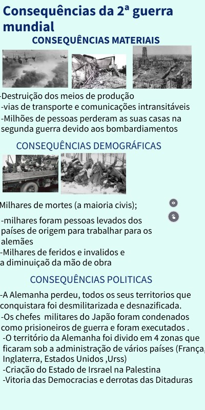 -O território da Alemanha foi divido em 4 zonas que ficaram sob a administração de vários países (França, Inglaterra, Estados Unidos ,Urss)-Criação do Estado de Irsrael na Palestina -Vitoria das Democracias e derrotas das Ditaduras