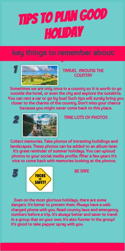 Even on the most glorious holidays, there are some dangers. It's better to prevent them. Always have a well-charged phone with you. Read country laws and emergency numbers before a trip. It's always better and saver to travel in a group that on your own. It's also funnier in the group! It's good to take papper spray with you.