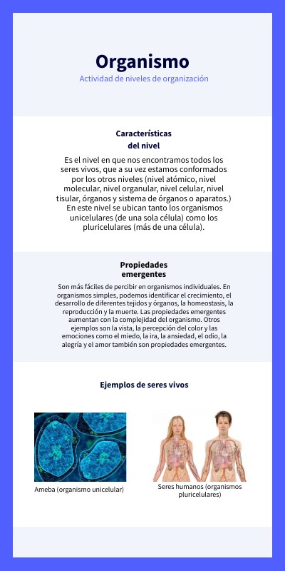 Es el nivel en que nos encontramos todos los seres vivos, que a su vez estamos conformados por los otros niveles (nivel atómico, nivel molecular, nivel organular, nivel celular, nivel tisular, órganos y sistema de órganos o aparatos.) En este nivel se ubican tanto los organismos unicelulares (de una sola célula) como los pluricelulares (más de una célula).
