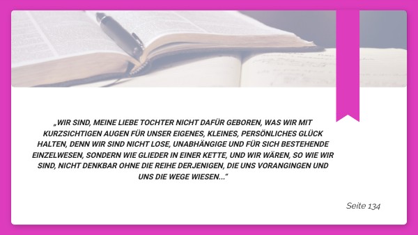 „Wir sind, meine liebe Tochter nicht dafür geboren, was wir mit kurzsichtigen Augen für unser eigenes, kleines, persönliches Glück halten, denn wir sind nicht lose, unabhängige und für sich bestehende Einzelwesen, sondern wie Glieder in einer Kette, und wir wären, so wie wir sind, nicht denkbar ohne die Reihe derjenigen, die uns vorangingen und uns die Wege wiesen...“