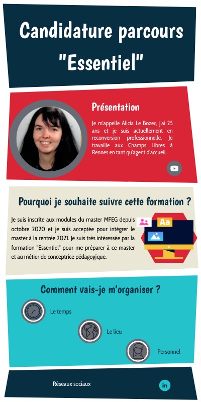 Je suis inscrite aux modules du master MFEG depuis octobre 2020 et je suis acceptée pour intégrer le master à la rentrée 2021. Je suis très intéressée par la formation "Essentiel" pour me préparer à ce master et au métier de conceptrice pédagogique.