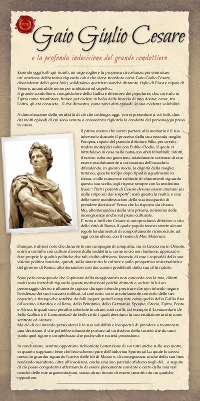 Essendo oggi tutti qui riuniti, mi urge cogliere la propensa circostanza per enunciare un' orazione deliberativa riguardo colui che viene ricordato come Gaio Giulio Cesare, discendente della gens Iulia, validissimo guerriero nonchè dittatore, figlio di Enea e nipote di Venere, ammirabile uomo per ambizioni ed aspetto... il grande condottiero, conquistatore della Gallia e difensore dei populares, che, arrivato in Egitto come trionfatore, finisce per cadere in balìa delle braccia di una donna; come, tra l'altro, gli era consueto... il che dimostra, come tanti altri episodi, la sua evidente volubilità. A dimostrazione della veridicità di ciò che sostengo, oggi, vorrei presentare a voi tutti, due, dei molti episodi di cui sono venuto a conoscenza riguardo la condotta del personaggio preso in causa. Dunque, è altresì noto che durante le sue campagne di conquista, sia in Grecia sia in Oriente, entrò a contatto con culture diverse dalla suddetta e, come se ciò non bastasse, apprezzò e fece proprie le qualità politiche che tali civiltà offrivano, facendo di esse i capisaldi della sua visione politica fondata, quindi, sulla sintesi tra le culture e sulla prospettiva universalistica del governo di Roma, allontanandosi così dai canoni predefiniti dalla sua città natale. Sono però consapevole che l'opinione della maggioranza non concorda con la mia, difatti molti sono increduli riguardo queste motivazioni poichè abituati a vedere in lui un personaggio deciso e altamente capace; dunque intendo precisare che non intendo negare l'evidenza dei suoi successi militari, al contrario, sono assolutamente convinto delle sue capacità, e ritengo che sarebbe da folli negare grandi conquiste come quella della Gallia fino all'oceano Atlantico e al Reno, della Britannia, della Germania, Spagna, Grecia, Egitto, Ponto e Africa, le quali sono peraltro attestate in alcuni suoi scritti, ad esempio il Commentarii de bello Gallico o il Commentarii de bello civili, i quali denotano la sua erudizione anche come scrittore ed oratore. Ma ciò di cui intendo persuadervi è la sua volubilità e incapacità di prendere o mantenere una decisione, il che potrebbe solamente portare ad un declino della società che da anni vanta quel rigore e compostezza che poche altre società possiedono. In conclusione, sembra opportuno richiamare l'attenzione di voi tutti anche sulla sua morte, in quanto sappiamo bene che fece scherno pure dell'indovina Spurinna! La quale lo aveva messo in guardia riguardo l'arrivo delle Idi di Marzo e, di conseguenza, anche della sua fine; rendendo manifesta, oltre all'insolenza, anche una sua parziale sfiducia negli dèi... a seguito di ciò posso congedarmi affermando di essere pienamente convinto e certo della mia tesi nonchè delle mie argomentazioni, senza alcun timore di essere smentito da un qualche oppositore.