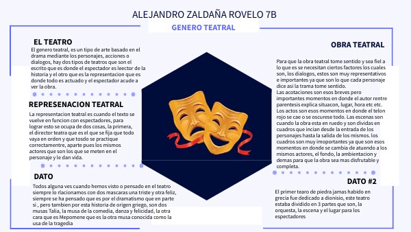 El genero teatral, es un tipo de arte basado en el drama mediante los personajes, acciones o dialogos, hay dos tipos de teatros que son el escrito que es donde el espectador es leector de la historia y el otro que es la representacion que es donde todo es actuado y el espectador acude a ver la obra.