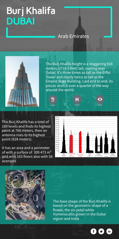 The Burj Khalifa has a total of 189 levels and finds its highest point at 768 meters, then an antenna rises to its highest point (828 meters). It has an area and a perimeter of with a surface of 309 473 m² and with 163 floors also with 58 acensors