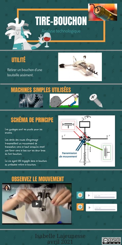Les guidages sont les pivots pour les leviers. Les dents des roues d'engrenage transmettent un mouvement de translation vers le haut lorsqu'on emet une force vers le bas sur les deux bras du tire-bouchon. La vis ayant été engagée dans le bouchon au préalable retire le bouchon.