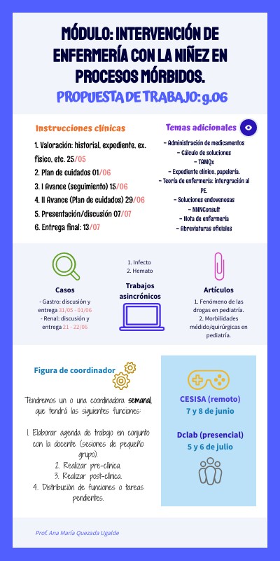 1. Valoración: historial, expediente, ex. físico, etc. 25/05 2. Plan de cuidados 01/06 3. I Avance (seguimiento) 15/06 4. II Avance (Plan de cuidados) 29/06 5. Presentación/discusión 07/07 6. Entrega final: 13/07