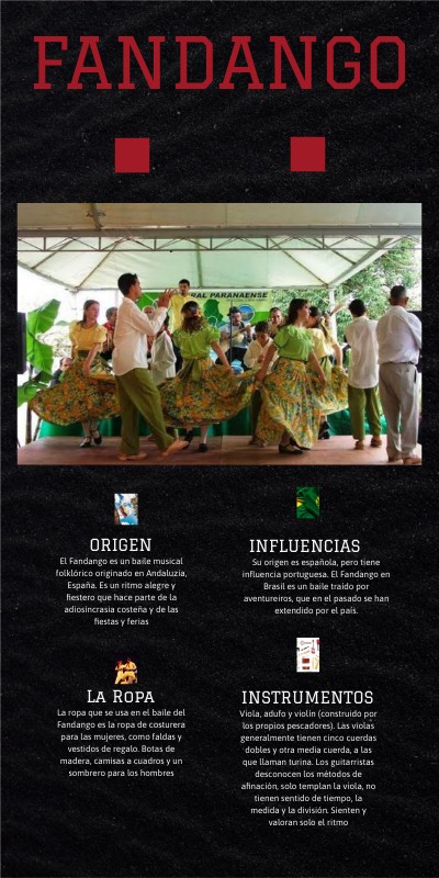 Su origen es española, pero tiene influencia portuguesa. El Fandango en Brasil es un baile traído por aventureiros, que en el pasado se han extendido por el país.
