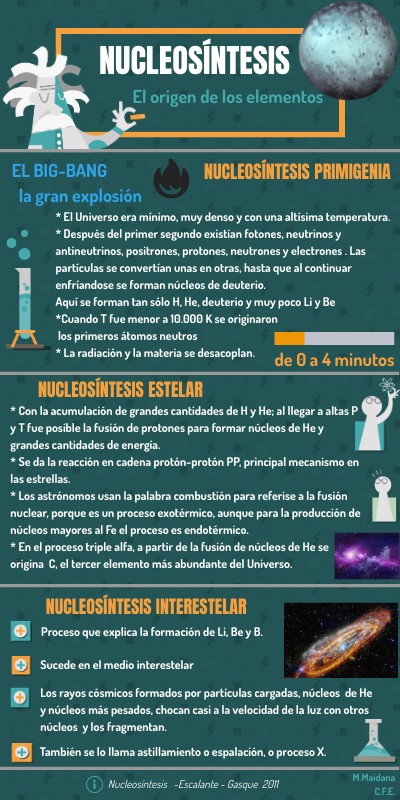 * El Universo era mínimo, muy denso y con una altísima temperatura. * Después del primer segundo existían fotones, neutrinos y antineutrinos, positrones, protones, neutrones y electrones . Las partículas se convertían unas en otras, hasta que al continuar enfríandose se forman núcleos de deuterio.Aquí se forman tan sólo H, He, deuterio y muy poco Li y Be *Cuando T fue menor a 10.000 K se originaron los primeros átomos neutros * La radiación y la materia se desacoplan.