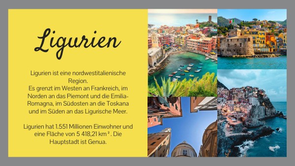 Ligurien ist eine nordwestitalienische Region.Es grenzt im Westen an Frankreich, im Norden an das Piemont und die Emilia- Romagna, im Südosten an die Toskana und im Süden an das Ligurische Meer. Ligurien hat 1.551 Millionen Einwohner und eine Fläche von 5 418,21 km². Die Hauptstadt ist Genua.