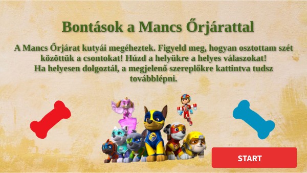 A Mancs Őrjárat kutyái megéheztek. Figyeld meg, hogyan osztottam szét közöttük a csontokat! Húzd a helyükre a helyes válaszokat! Ha helyesen dolgoztál, a megjelenő szereplőkre kattintva tudsz továbblépni.