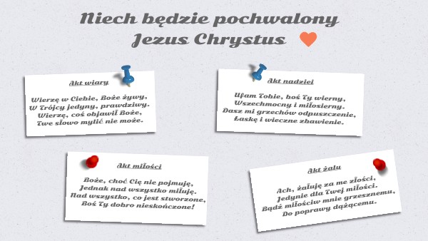 Akt nadzieiUfam Tobie, boś Ty wierny,Wszechmocny i miłosierny.Dasz mi grzechów odpuszczenie,Łaskę i wieczne zbawienie.