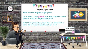 Needing to create an infographic or digital poster? Look no further! Click the pink arrow on the laptop on my desk to see a few options for creating your infographic/digital poster! Don't let those options limit you, though! If you have another website in mind or want to draw your infographic, talk to your teacher!