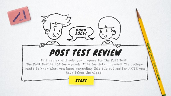 This review will help you prepare for the Post Test. The Post Test is NOT for a grade. It is for data purposes. The college wants to know what you know regarding this subject matter AFTER you have taken the class!