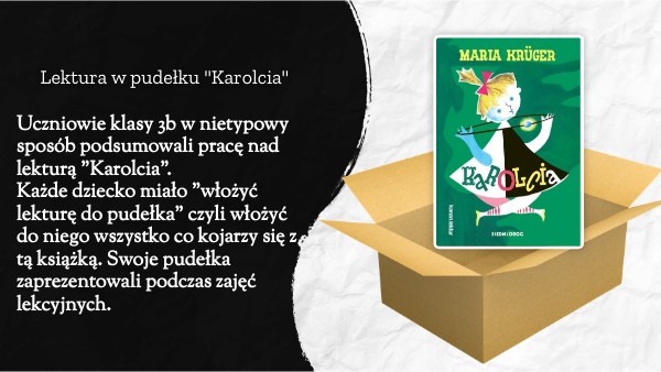 Uczniowie klasy 3b w nietypowy sposób podsumowali pracę nad lekturą "Karolcia". Każde dziecko miało "włożyć lekturę do pudełka" czyli włożyć do niego wszystko co kojarzy się z tą książką. Swoje pudełka zaprezentowali podczas zajęć lekcyjnych.