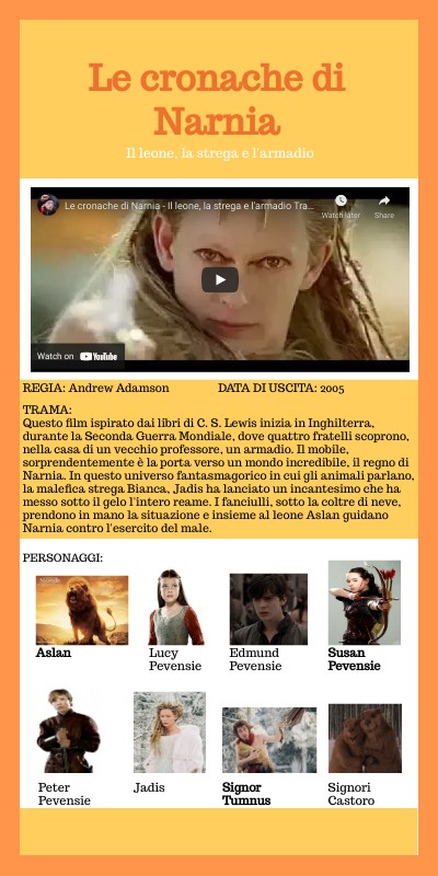 TRAMA: Questo film ispirato dai libri di C. S. Lewis inizia in Inghilterra, durante la Seconda Guerra Mondiale, dove quattro fratelli scoprono, nella casa di un vecchio professore, un armadio. Il mobile, sorprendentemente è la porta verso un mondo incredibile, il regno di Narnia. In questo universo fantasmagorico in cui gli animali parlano, la malefica strega Bianca, Jadis ha lanciato un incantesimo che ha messo sotto il gelo l'intero reame. I fanciulli, sotto la coltre di neve, prendono in mano la situazione e insieme al leone Aslan guidano Narnia contro l'esercito del male.
