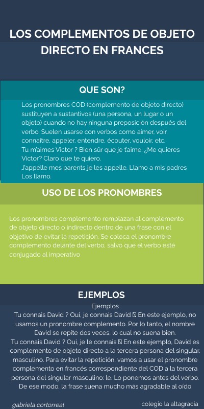 Los pronombres complemento remplazan al complemento de objeto directo o indirecto dentro de una frase con el objetivo de evitar la repetición. Se coloca el pronombre complemento delante del verbo, salvo que el verbo esté conjugado al imperativo
