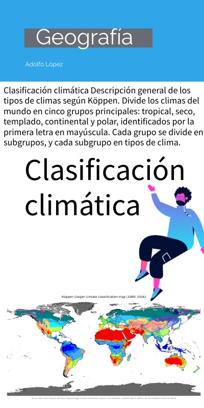 Clasificación climática Descripción general de los tipos de climas según Köppen. Divide los climas del mundo en cinco grupos principales: tropical, seco, templado, continental y polar, identificados por la primera letra en mayúscula. Cada grupo se divide en subgrupos, y cada subgrupo en tipos de clima.