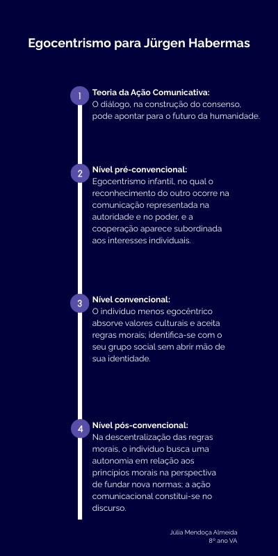 Nível pós-convencional:Na descentralização das regras morais, o indivíduo busca uma autonomia em relação aos princípios morais na perspectiva de fundar nova normas; a ação comunicacional constitui-se no discurso.