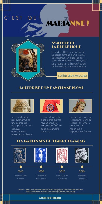 Sources : - https://enseigner.tv5monde.com/fiches-pedagogiques-fle/la-nouve14lle-marianne - https://www.timbres-de-france.com/thematique/affiche_marianne.php