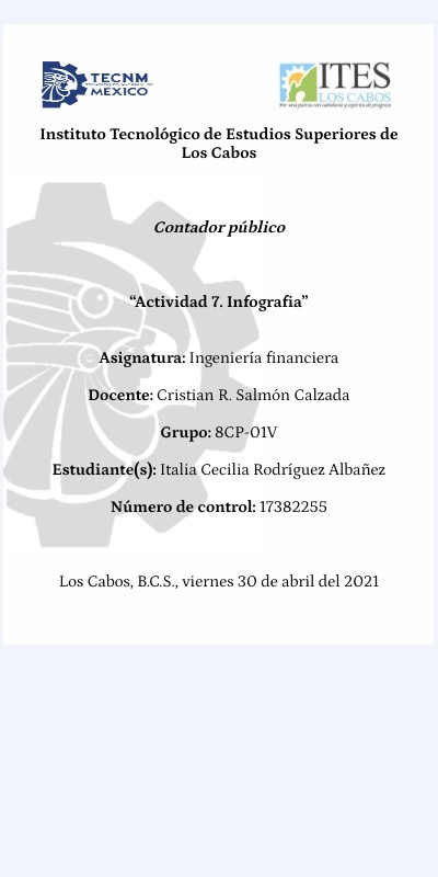 Instituto Tecnológico de Estudios Superiores de Los Cabos Contador público “Actividad 7. Infografia” Asignatura: Ingeniería financiera Docente: Cristian R. Salmón Calzada Grupo: 8CP-01V Estudiante(s): Italia Cecilia Rodríguez Albañez Número de control: 17382255 Los Cabos, B.C.S., viernes 30 de abril del 2021