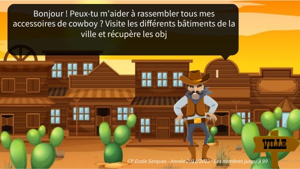 Bonjour ! Peux-tu m'aider à rassembler tous mes accessoires de cowboy ? Visite les différents bâtiments de la ville et récupère les objets. Quand tu les as tous, clique sur moi en haut à droite.