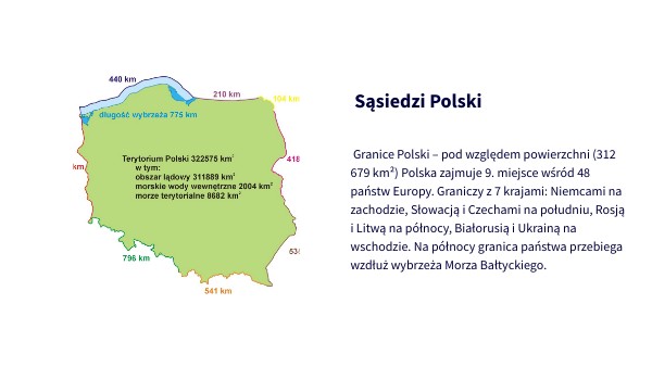 Granice Polski – pod względem powierzchni (312 679 km²) Polska zajmuje 9. miejsce wśród 48 państw Europy. Graniczy z 7 krajami: Niemcami na zachodzie, Słowacją i Czechami na południu, Rosją i Litwą na północy, Białorusią i Ukrainą na wschodzie. Na północy granica państwa przebiega wzdłuż wybrzeża Morza Bałtyckiego.
