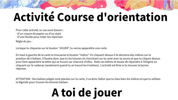 Règle du jeu : Lorsque tu cliqueras sur le bouton "JOUER", tu verras apparaître une carte. En haut à gauche de la carte tu trouveras le bouton "Indice". En cliquant dessus il te donnera des indices sur la position de 6 balises. Il faudra donc que tu les trouves en cherchant sur la carte avec ta souris et que tu cliques dessus pour faire apparaitre la lettre qui se trouve sur chacune d'elles. Note ces lettres et essaie de répondre à l'énigme en cliquant sur le cadenas (seulement quand tu as trouvé les 6 balises). L'activité est finie si tu trouves la bonne réponse. ATTENTION : Des balises pièges sont placées sur la carte, il va donc falloir que tu lises bien les indices et que tu utilises la légende pour trouver les bonnes balises.