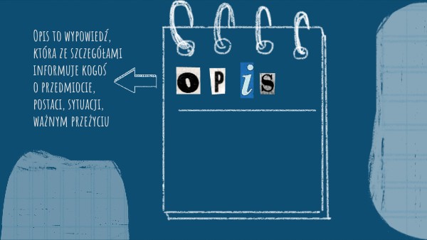 Opis to wypowiedź, która ze szczegółami informuje kogoś o przedmiocie, postaci, sytuacji, ważnym przeżyciu
