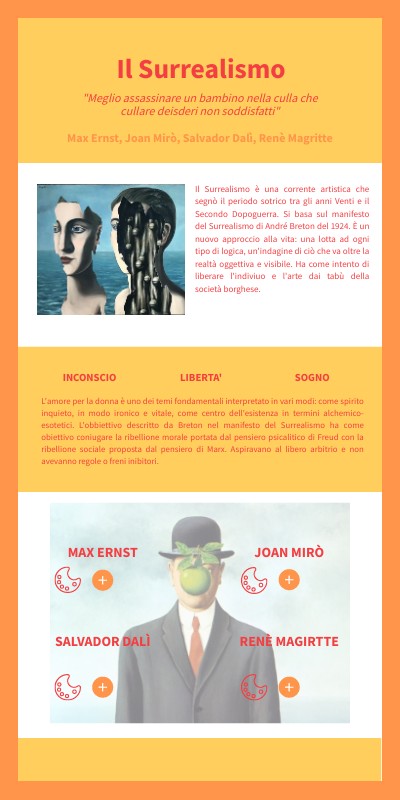 Il Surrealismo è una corrente artistica che segnò il periodo sotrico tra gli anni Venti e il Secondo Dopoguerra. Si basa sul manifesto del Surrealismo di André Breton del 1924. È un nuovo approccio alla vita: una lotta ad ogni tipo di logica, un'indagine di ciò che va oltre la realtà oggettiva e visibile. Ha come intento di liberare l'indiviuo e l'arte dai tabù della società borghese.
