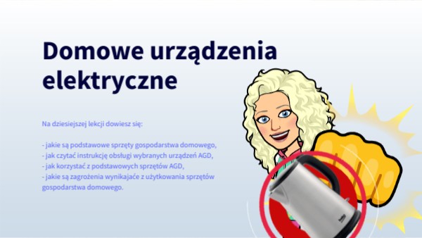 Na dziesiejszej lekcji dowiesz się: - jakie są podstawowe sprzęty gospodarstwa domowego, - jak czytać instrukcję obsługi wybranych urządzeń AGD, - jak korzystać z podstawowych sprzętów AGD, - jakie są zagrożenia wynikajaće z użytkowania sprzętów gospodarstwa domowego.