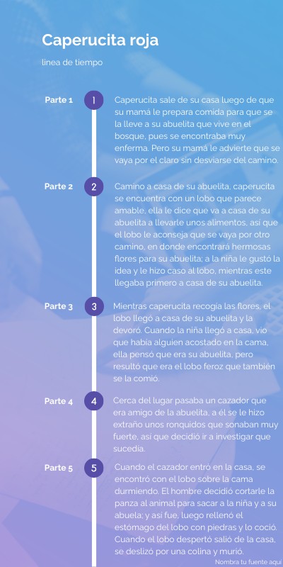 Mientras caperucita recogía las flores, el lobo llegó a casa de su abuelita y la devoró. Cuando la niña llegó a casa, vio que había alguien acostado en la cama, ella pensó que era su abuelita, pero resultó que era el lobo feroz que también se la comió.