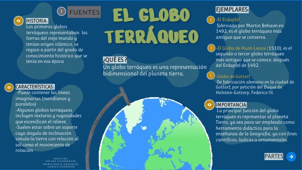 CARACTERÌSTICAS: -Puede contener las líneas imaginarias (meridianos y paralelos) -Algunos globos terráqueos incluyen texturas y rugosidades que escenifican el relieve, -Suelen estar sobre un soporte cuyo ángulo de inclinación simula la tierra con relación al sol como el movimiento de rotaciòn